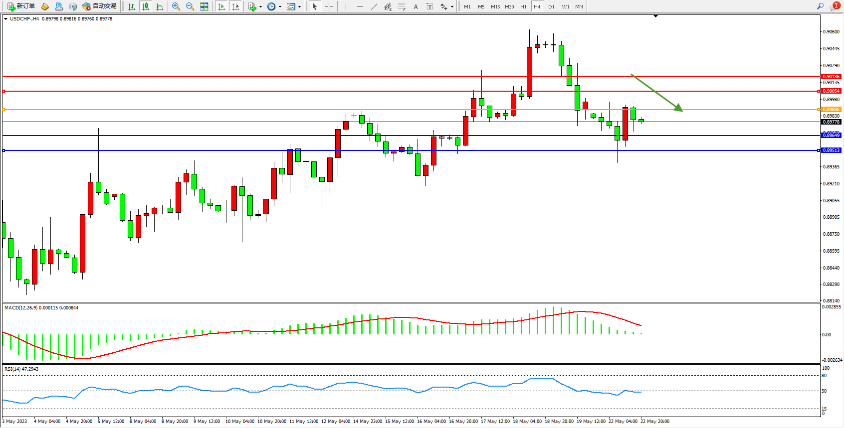 美元瑞郎USDCHF——4小时K线图显示: