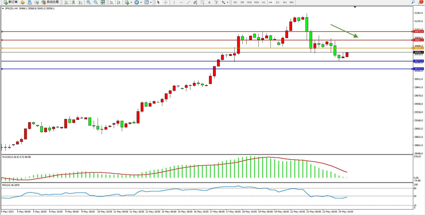 日经225指数5月24日(周三)收盘下跌264.27点,跌幅0.85%,报30693.50点。日本政府基本决定将新增对高中生每月1万日元(约合人民币510元)的发放额。目前发放年龄上限为初中生。