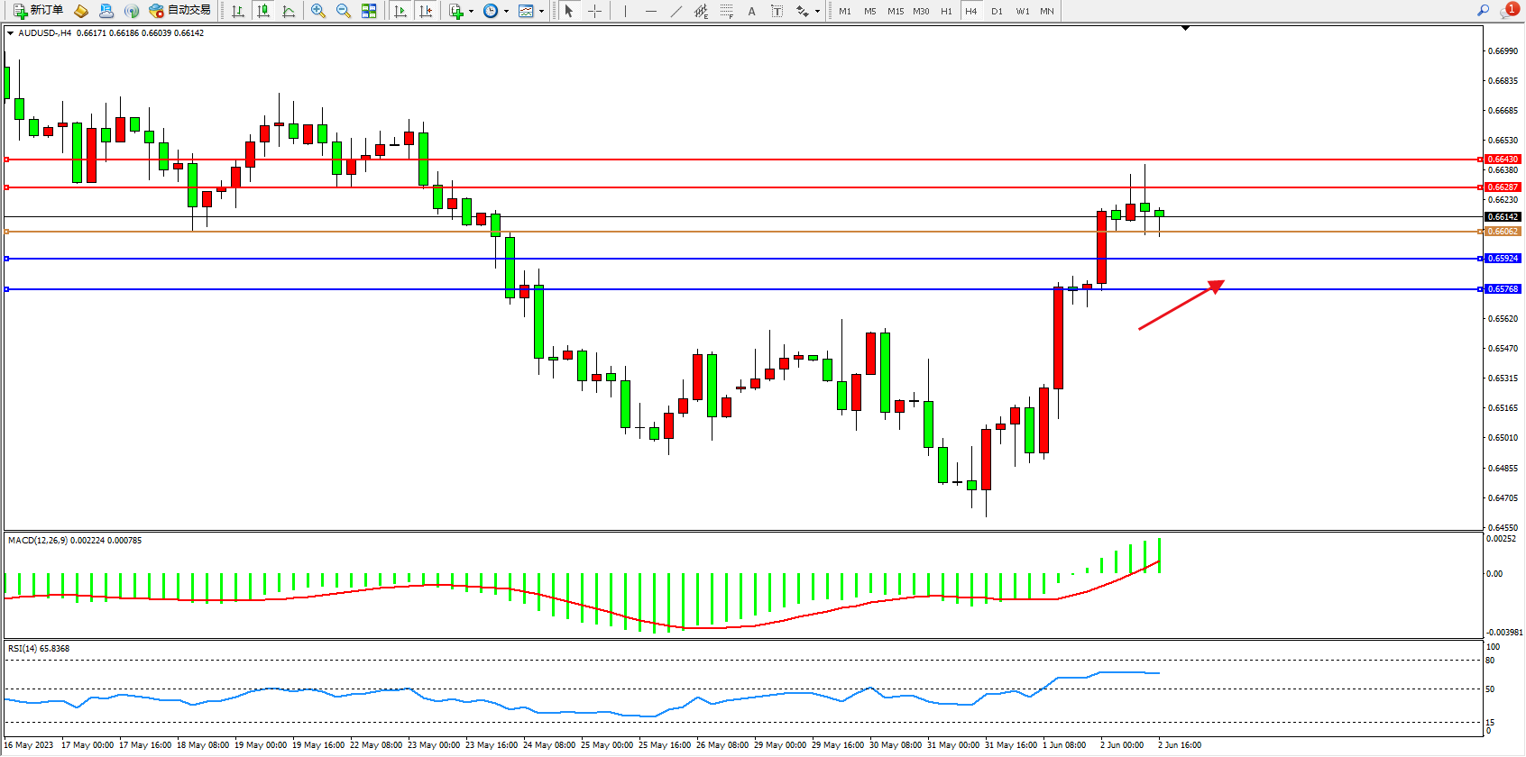 交易策略:0.66062上方看涨,目标0.66287  0.66430