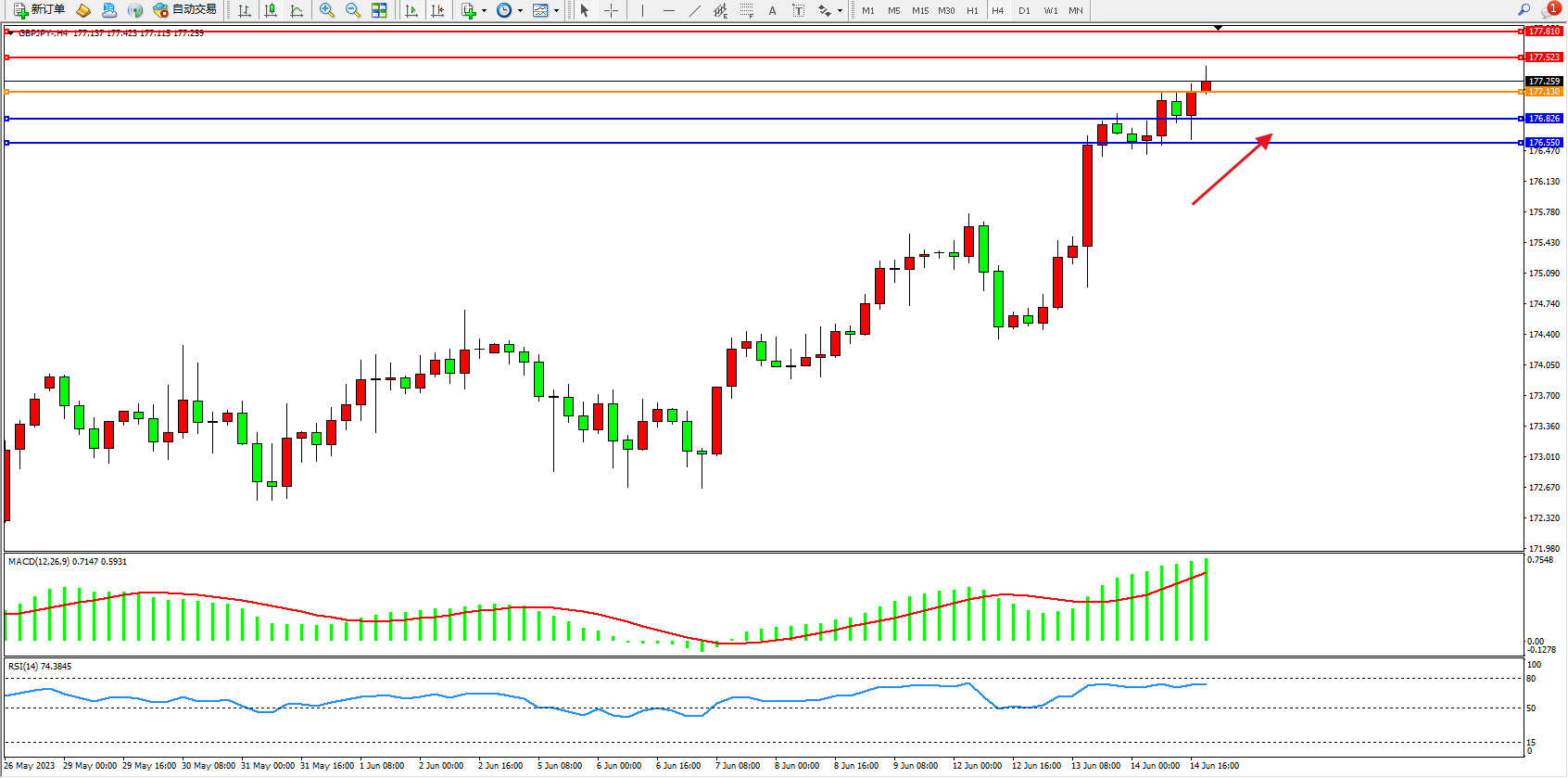 交易策略:177.130上方看涨,目标177.523  177.810
