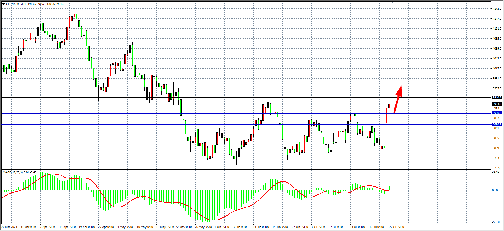 4小时图看,沪深300强势走高上破3900一线,MACD上穿零轴,行情形成破位上攻,支撑关注3870-3900附近,上方压力看3940-3980。