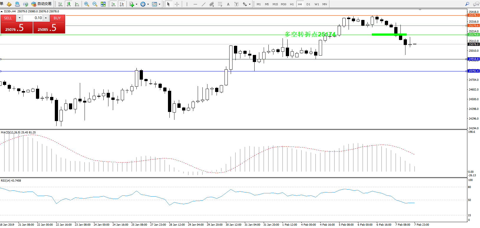 道琼斯指数DJ30—— 4小时K线图显示: