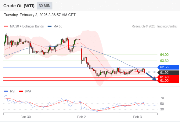 交易策略: 在 62.55 之下,看跌,目标价位为 61.40 ,然后为 61.00 。