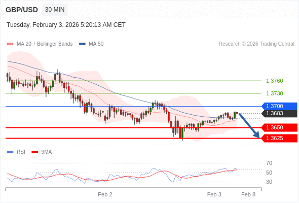 交易策略: 在 1.3700 之下,看跌,目标价位为 1.3650 ,然后为 1.3625 。