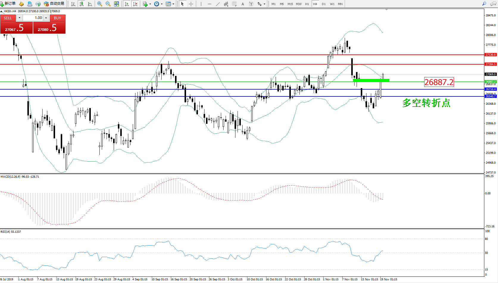 香港恒生指数1119日(周二)收盘上涨412.71点,涨幅1.55%,报27093.80点;华为概念板块涨超5%,单日涨幅为1031日以来最大。港股低开向下扩大跌幅至26605。低位见买盘涌出,企稳再造好,向上大幅抽升287点,恒指高见26968,直逼27000关口。恒指如期迎来反弹,而上涨的同时迎来成交量的放大,说明这样的涨势是较为积极可靠的。外围局势好转,摩根资产管理表示上调全球股市展望,主因中美两国贸易谈判有望取得突破,美国衰退风险降低,提振市场情绪。