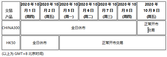 因应2020年10月1日至10月8日期间为中国内地及香港市场中秋国庆双节假期,以下部分产品的交易时间将受假期影响休市,敬请阁下留意知悉!