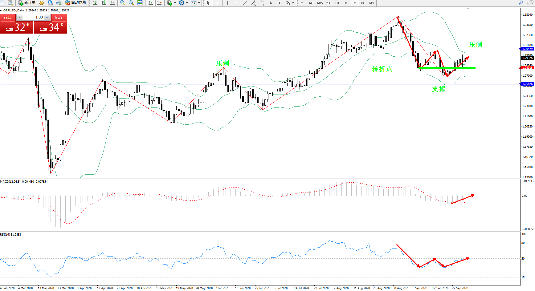 高位空头动力延续布林带指标中下轨区间弱势震荡下行后,得到支撑开始反转震荡上移,纠结于布林带指标中上轨区间维持震荡,布林带指标呈张口走势后开始收口平移中,低位多头动力有缓慢回升态势,上方压制关注1.30479附近,低位支撑关注1.25876位置,关注中轨下方1.28016附近转折点,该位正式前期压制节点,MACD指标处于0轴线下方空头区域维持整理平移有回升迹象,RSI指标处于空头区域整理后回升至50均衡线附近徘徊中,如图: