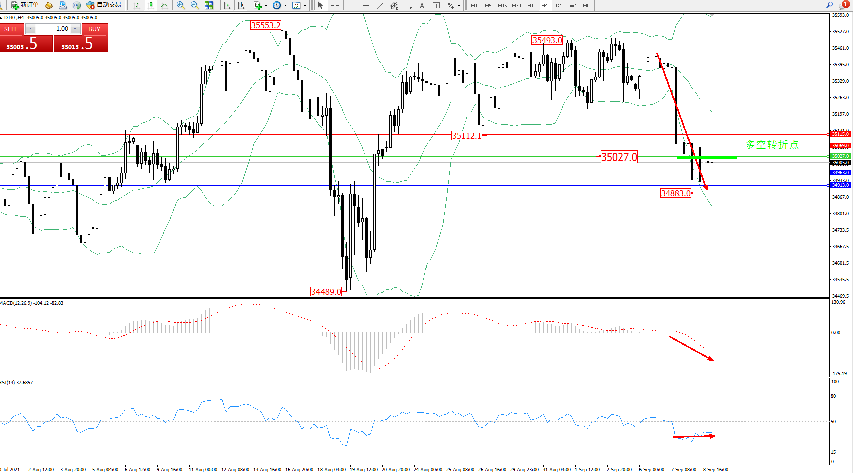 道琼斯指数DJ30—— 4小时K线图显示: