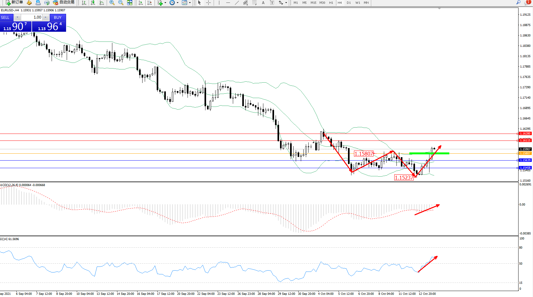 交易策略:1.15807上方看涨,目标1.16115、1.16280