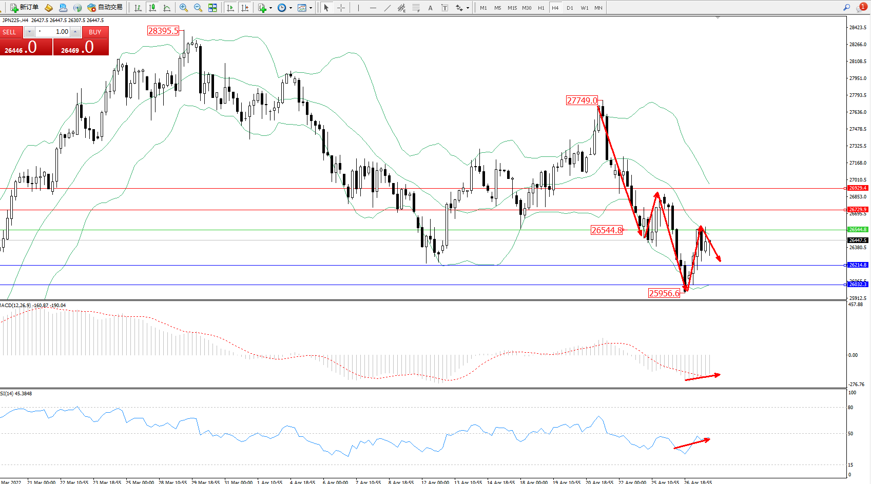 技术点评:空头动力延续布林带指标通道中下轨区间持续震荡下挫,低位抵达25956附近节点后短暂拉升,触及布林带指标中轨附近节点后整理,空头动力有继续下行态势,布林带指标呈收口走势不断下行,MACD指标处于空头区域维持弱势震荡,RSI指标处于空头区域维持整理后开始缓慢上移;