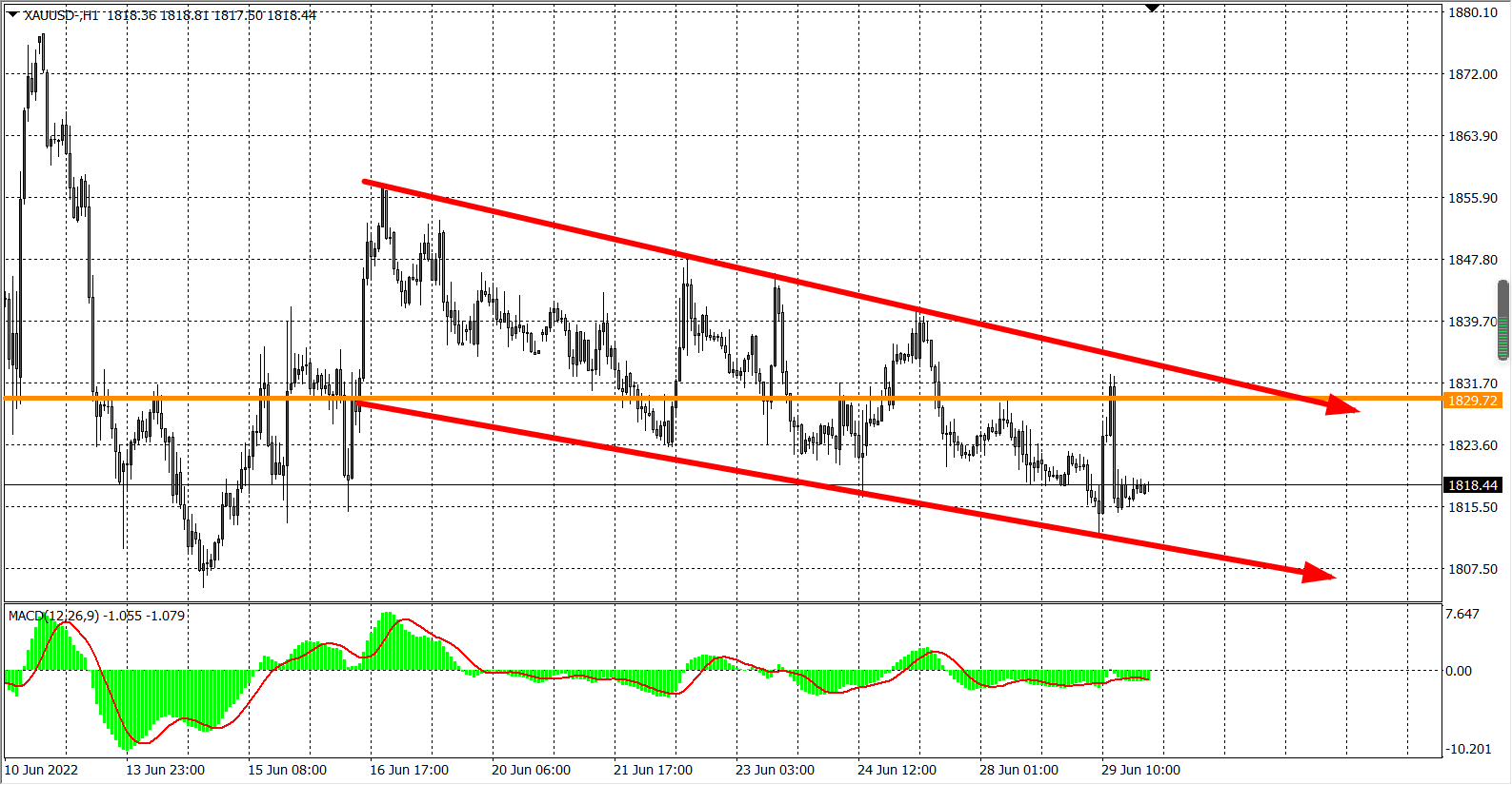 周三(6月29日),美国第一季度核心PCE物价指数和实际GDP年化季率均高出预期,表明通胀仍处于高位,随后鲍威尔讲话再次重申美联储将专注通胀,同时相信美国经济仍可能软着陆。现货黄金呈过山车行情,在触碰1830附近再度后跳水,并回吐所有涨幅,最终收跌0.1%,报1817.92美元/盎司。