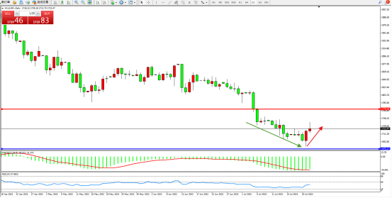 空头动力持续下行态势良好,低位短期得到支撑反转上移,多头动力有伺机入场迹象,上方压制关注1770附近,低位支撑关注1675附近,MACD指标处于空头区域低位整理平移,RSI指标处于空头区域维持整理缓慢上行,如图: