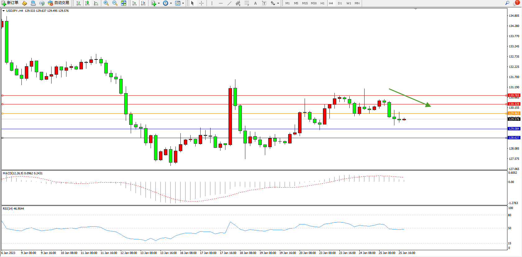 交易策略:129.860下方看跌,目标129.084、128.627