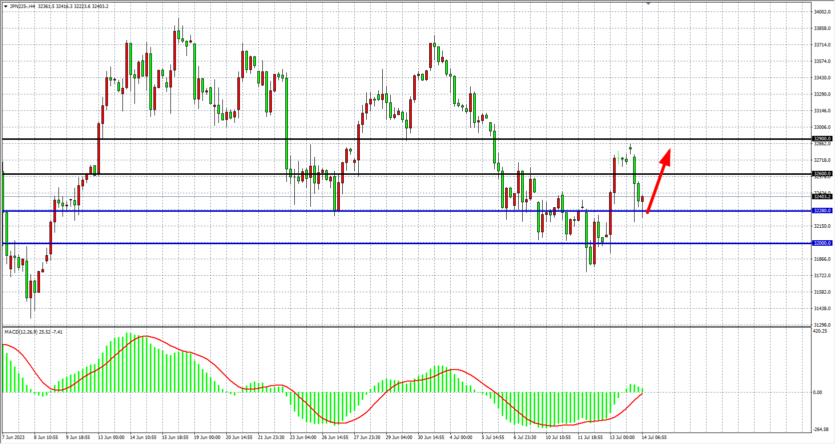 4小时图看,日经指数受32900压制出现大幅回撤,MACD量能在零轴上缩量,回调结束后仍有走高动能,支撑关注32280附近,上方阻力看32600-32900。