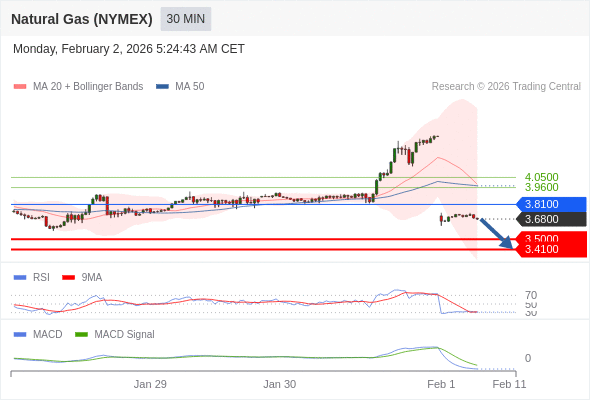 Natural Gas (NYMEX) (MAR6) 当日内: 看跌,在 3.8100 之下。
